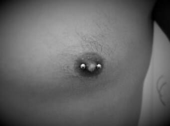 Piercing behind the nipple through the areola making the nipple protrude a little. Inc. titanium barbell or ring