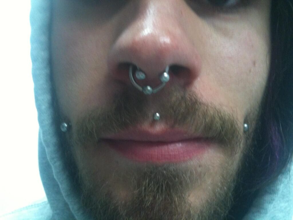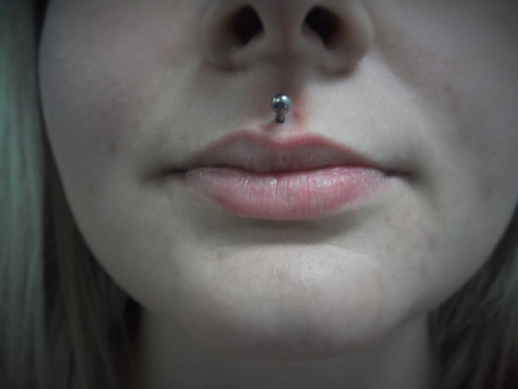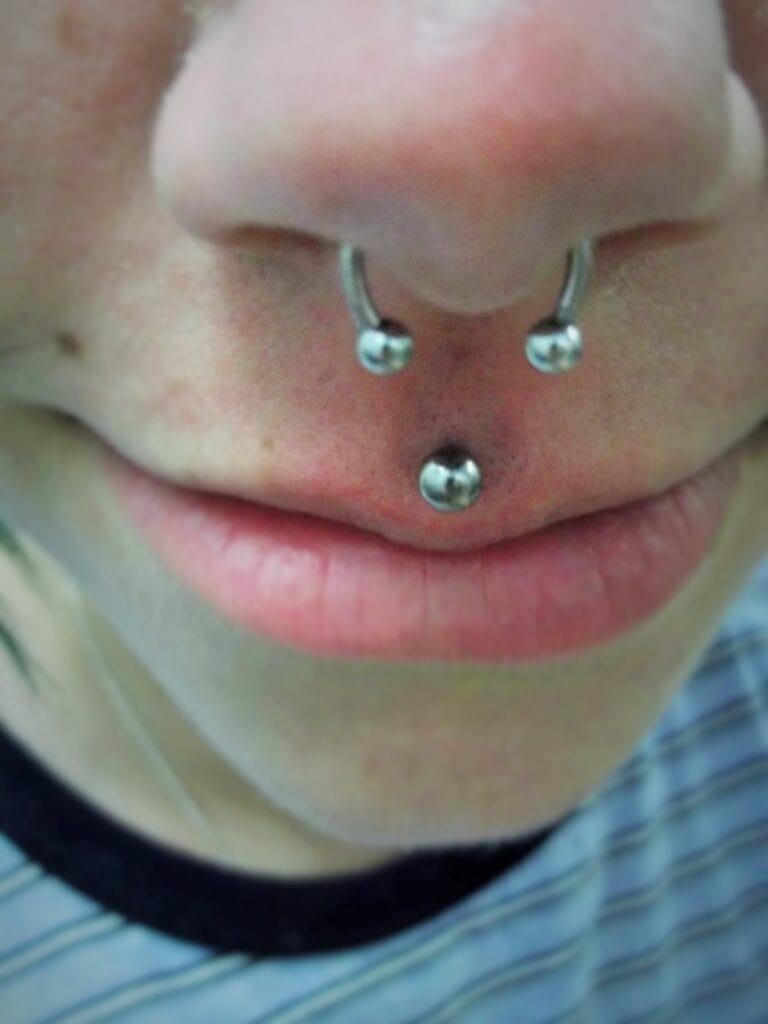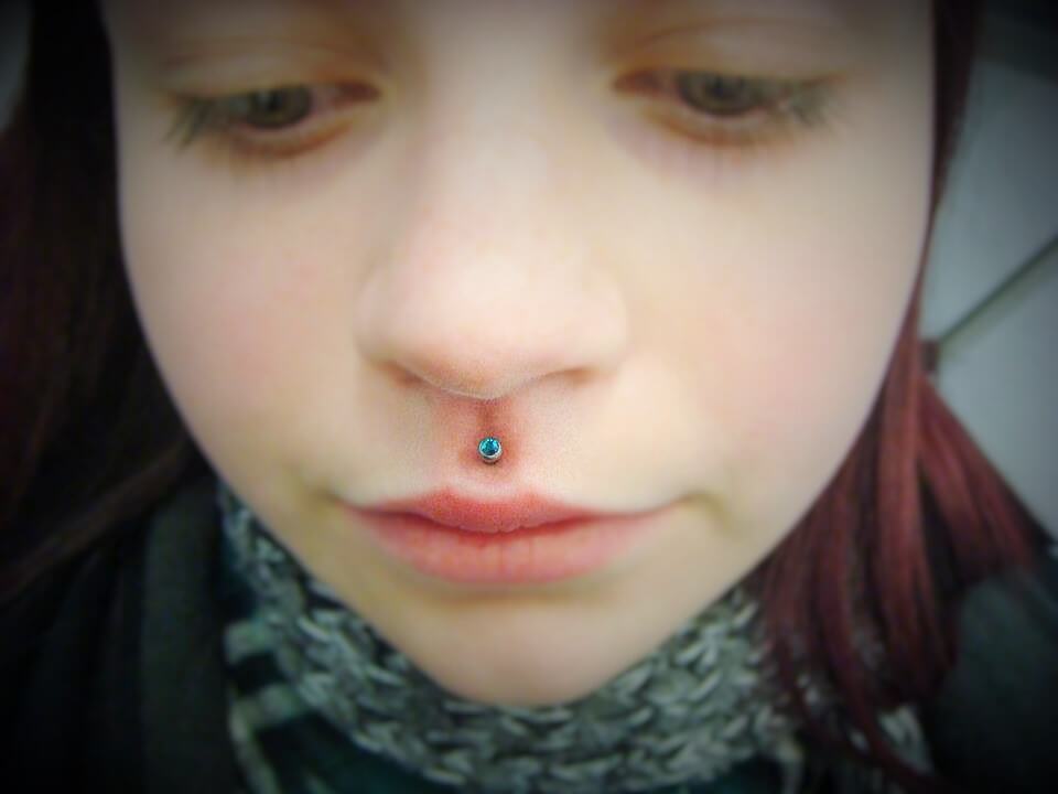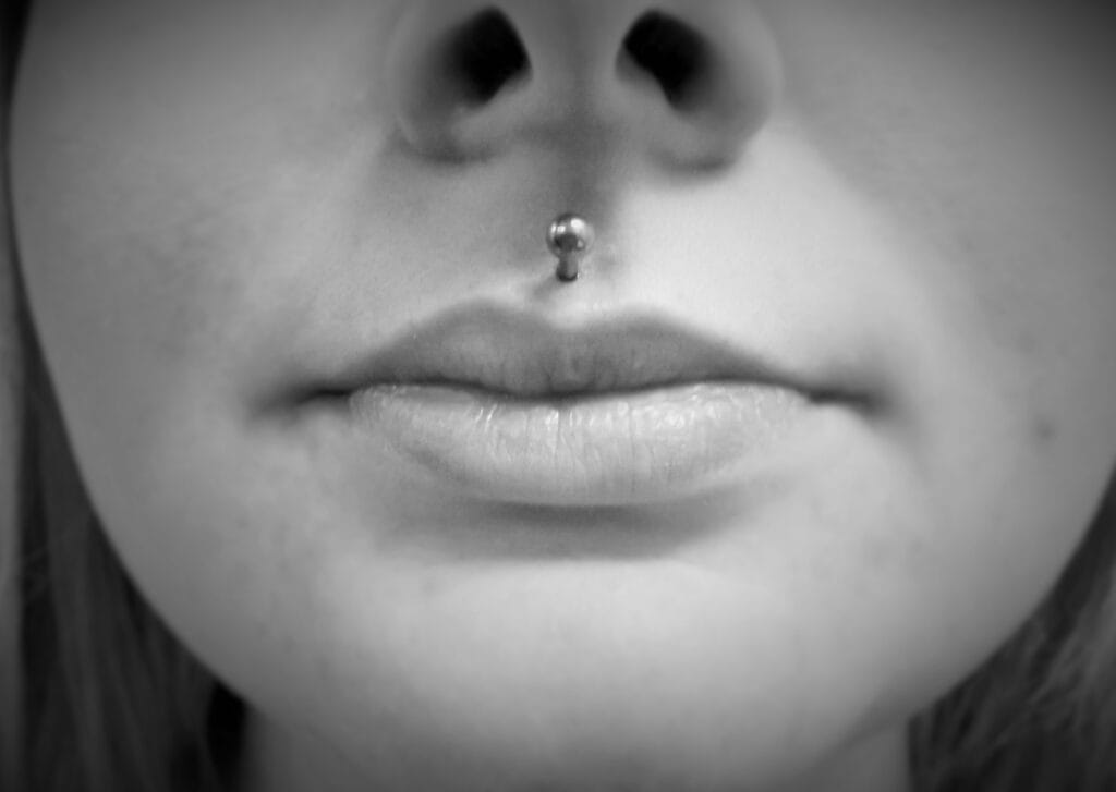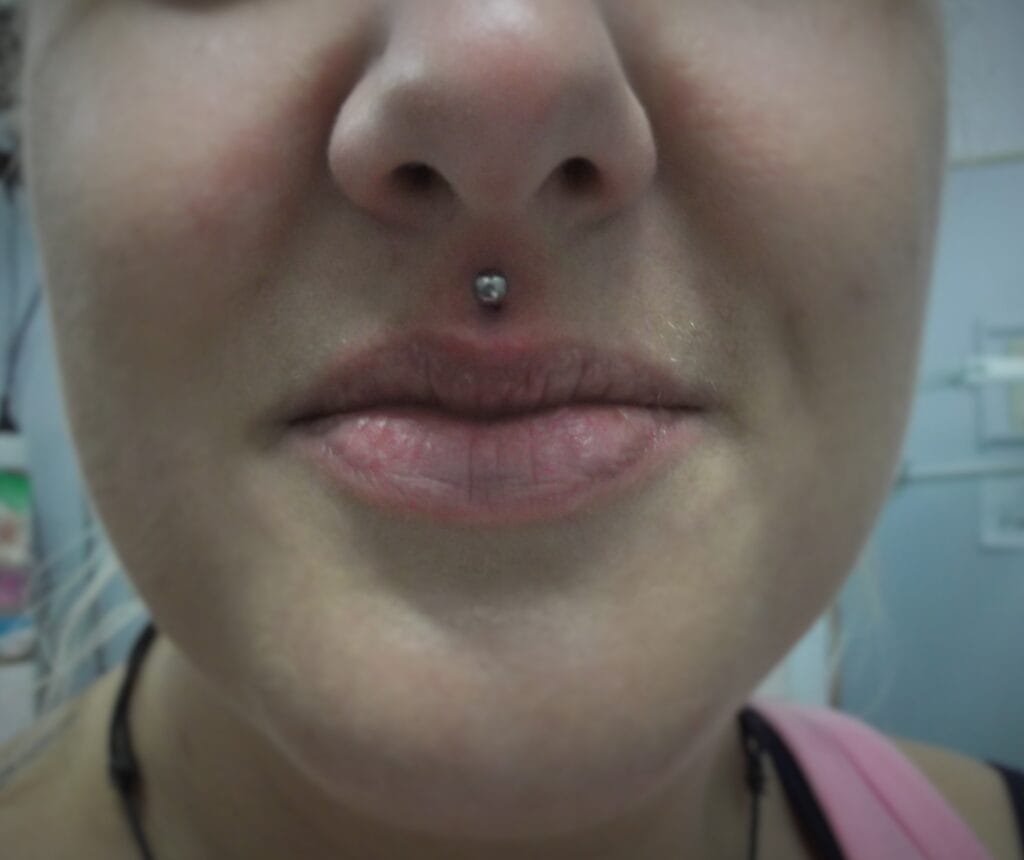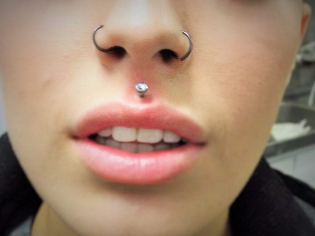 This is the piercing of the upper lip in the centre below the septum. If placed well, it can look amazing. While this piercing may date back 1000s of years, its modern resurgence took place with the punk movement, with mainly men getting this in combination with other lip piercings. In the early 2000s when jewelled labrets became available, many women found this subtle touch of bling a great piercing to get. There is less variety of jewellery styles available for this facial piercing due to its placement, however in recent years with the development of internally threaded jewellery and more places specialising in fancy body jewellery, many more decorative items have come onto the market. In 2019, it is still popular among women and the piercing enthusiast male generally with multiple lip piercings. This piercing of course can also be stretched to larger gauges.