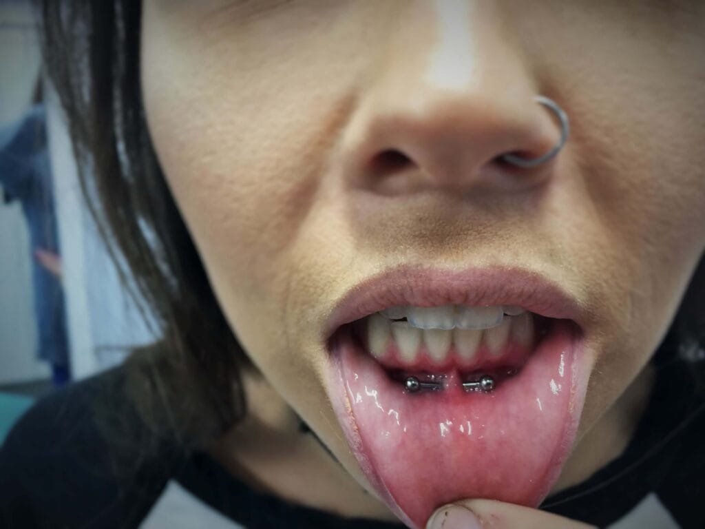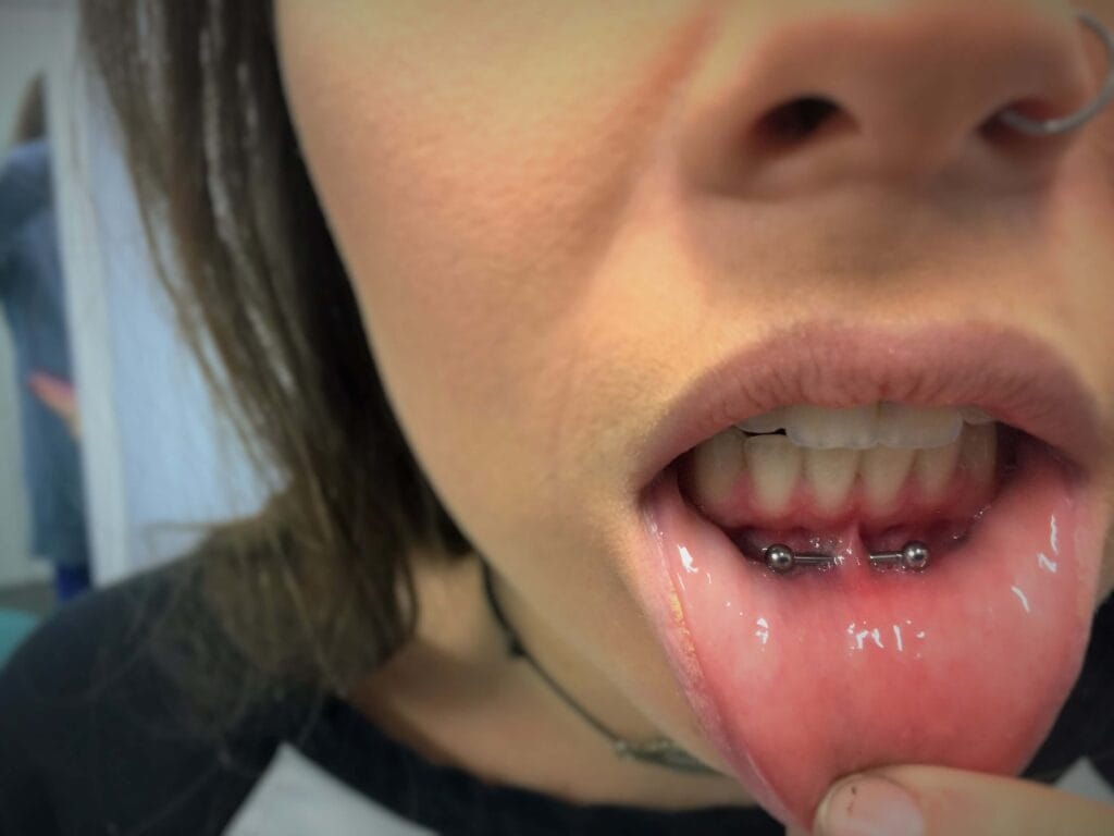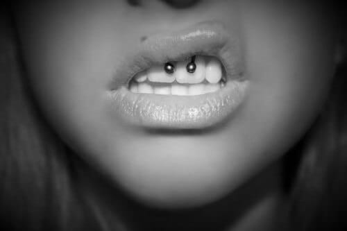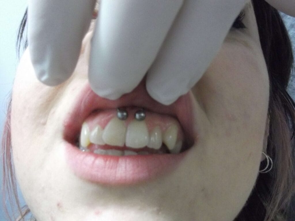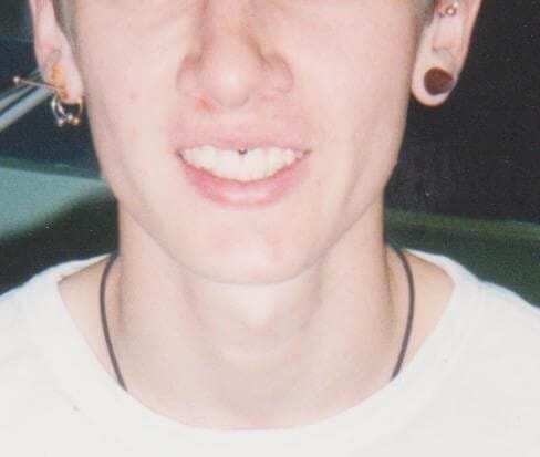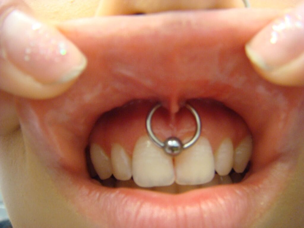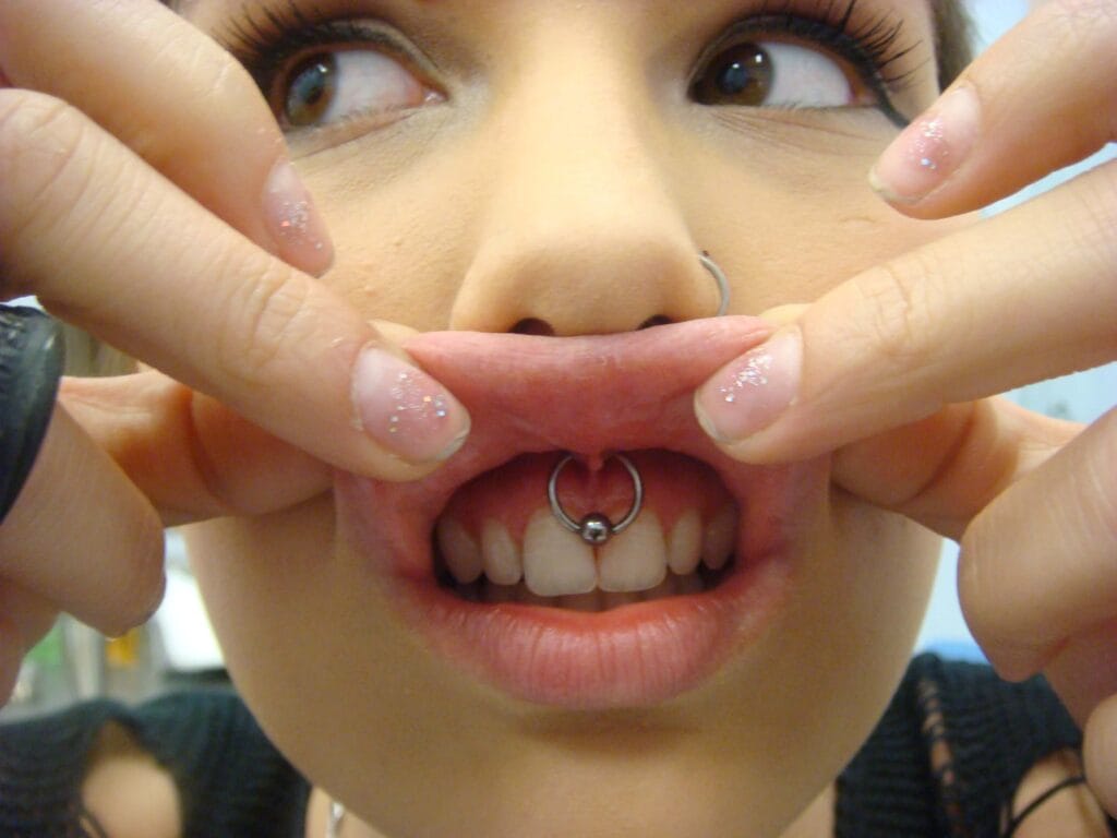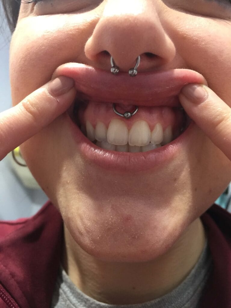 This facial piercing goes through the small amount of skin (frenum) in the centre under the top lip. Prior to the early 2000s, this piercing was known as the “scrumper”. I am guessing this name was coined during the punk movement, but as it became more popular and was often only visible when someone smiled, it was renamed the smiley piercing. This piercing can cause damage to the tooth enamel and/or the gum, so careful choice of jewellery is essential. A curved bar is often good to wear for everyday wear, changing to a circular or bead ring with jewels for occasional wear and special occasions.