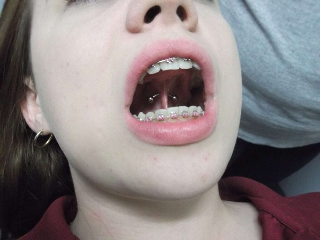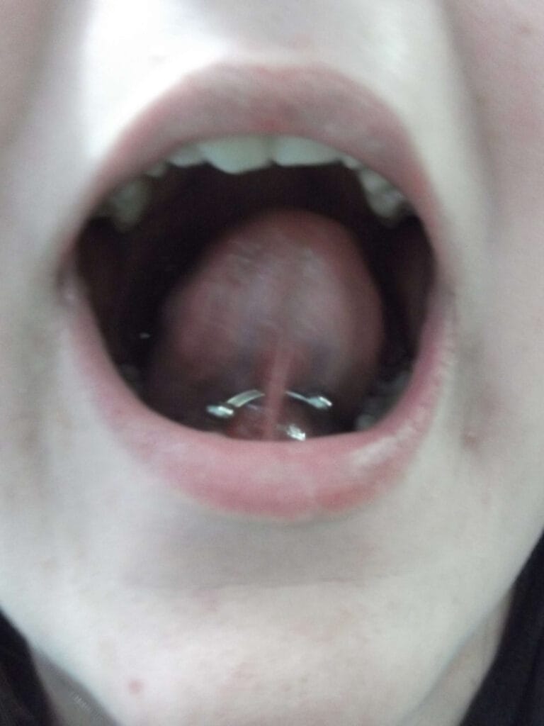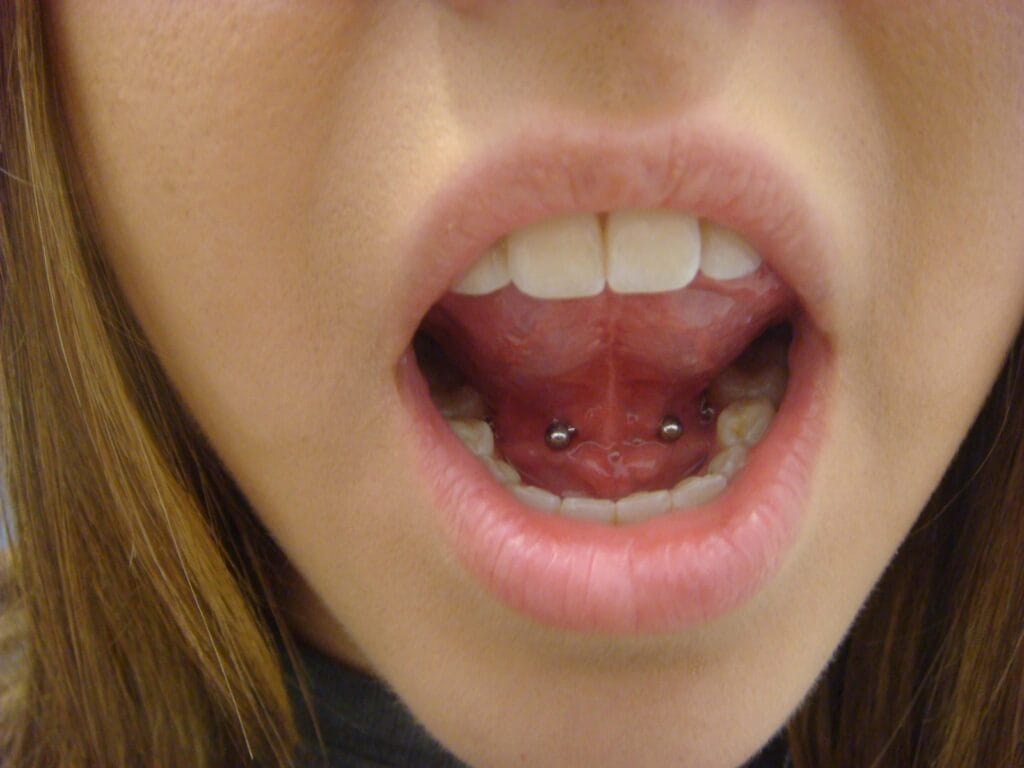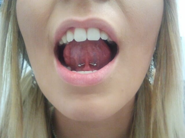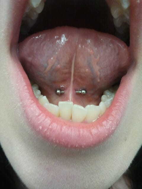 The tongue web piercing did not really take off until the late 1990s to early 2000s in Australia. This piercing needs to be placed carefully, and while it seems to be an easy piercing to do, there are saliva ducts under the tongue that can be damaged if they’re hit. Damaged saliva ducts do not heal, and the entire duct needs to be removed with a surgical procedure. Care needs to be taken to avoid this, and so it should only be done by a professional who knows how to identify these ducts. Generally a curved bar or circular bar is put into this piercing, but a ball closure ring can be used.